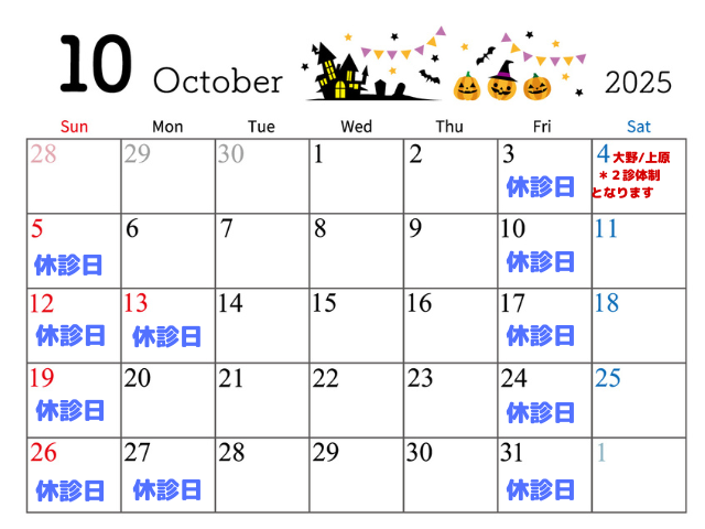 10月4日(土)は院長と上原医師の2名体制での診察となります。