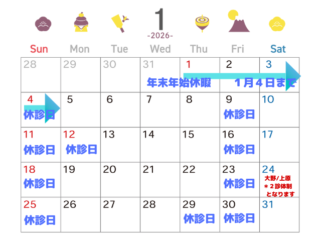 1月24日(土)は院長と上原医師の2名での対応となります。